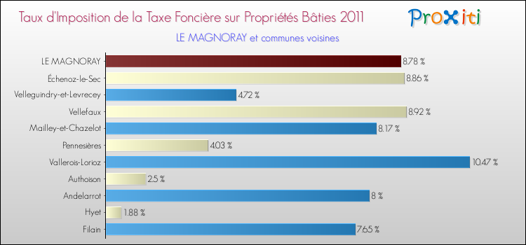 En 2011, le taux de la taxe foncière sur le bâti vôté par le conseil municipal de Le Magnoray était de : 8.78 %.