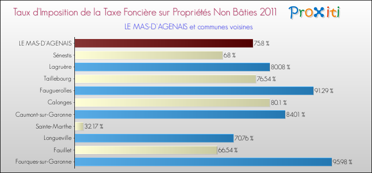 Vous trouverez ci-dessous des graphiques qui vous permettent de situer le taux de la taxe foncière sur le non bâti de Le Mas-d'Agenais par rapport aux communes voisines.