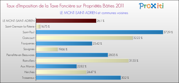 En 2011, le taux de la taxe foncière sur le bâti vôté par le conseil municipal de Le Mont-Saint-Adrien était de : 26.1 %.
