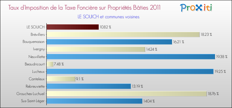 En 2011, le taux de la taxe foncière sur le bâti vôté par le conseil municipal de Le Souich était de : 10.82 %.