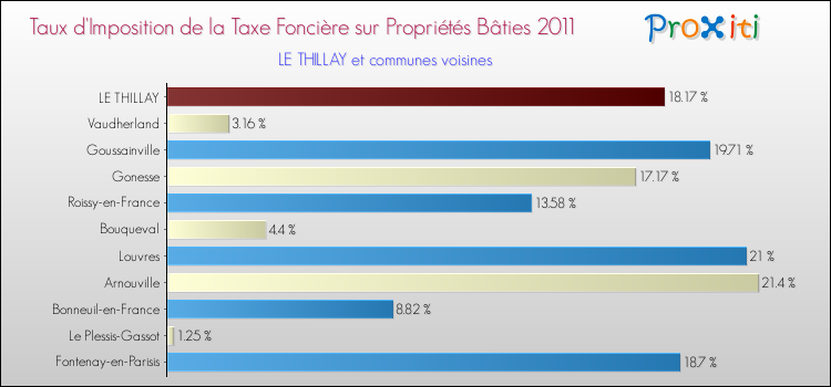 En 2011, le taux de la taxe foncière sur le bâti vôté par le conseil municipal de Le Thillay était de : 18.17 %.
