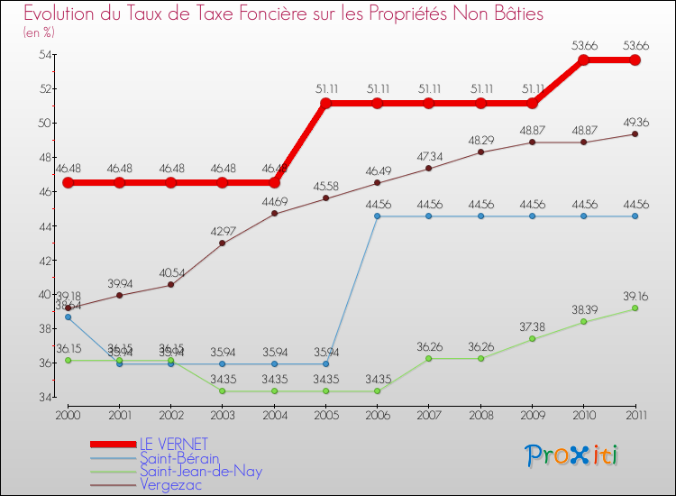 A Le Vernet, le taux de taxe foncière sur le non bâti a donc augmenté de 15.45 % entre 2000 et 2011.