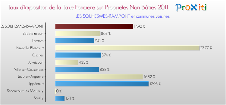 Vous trouverez ci-dessous des graphiques qui vous permettent de situer le taux de la taxe foncière sur le non bâti de Les Souhesmes-Rampont par rapport aux communes voisines.
