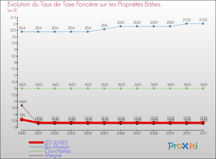 A noter : la valeur moyenne de ce taux de taxe foncière sur le bâti dans les communes françaises similaires à Les Ulmes était de 13.42 %, en 2011.