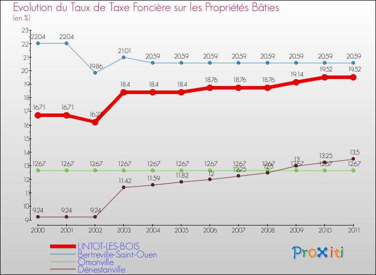 A Lintot-les-Bois, le taux de taxe foncière sur le bâti a donc augmenté de 16.82 % entre 2000 et 2011.