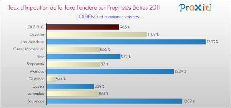 En 2011, le taux de la taxe foncière sur le bâti vôté par le conseil municipal de Loubieng était de : 9.65 %.