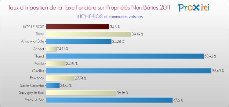En 2011, le taux de la taxe foncière sur le non bâti vôté par le conseil municipal de Lucy-le-Bois était de : 34.8 %.