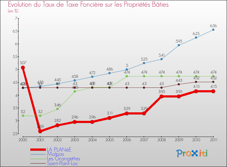 Pendant la même période, les communes françaises similaires à La Planée, ont vu leur taux de taxe foncière sur le bâti baisser de 8.59 % en moyenne entre 2000 et 2011.
