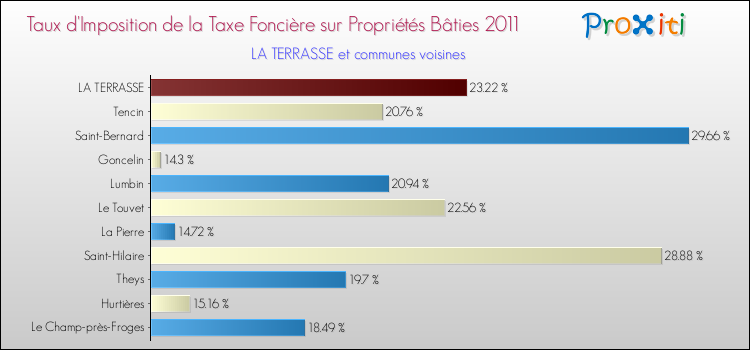 En 2011, le taux de la taxe foncière sur le bâti vôté par le conseil municipal de La Terrasse était de : 23.22 %.