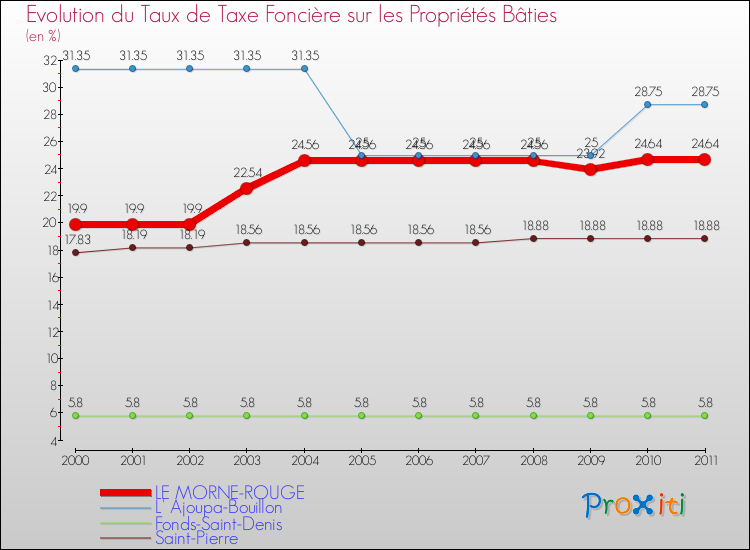A Le Morne-Rouge, le taux de taxe foncière sur le bâti a donc augmenté de 23.82 % entre 2000 et 2011.
