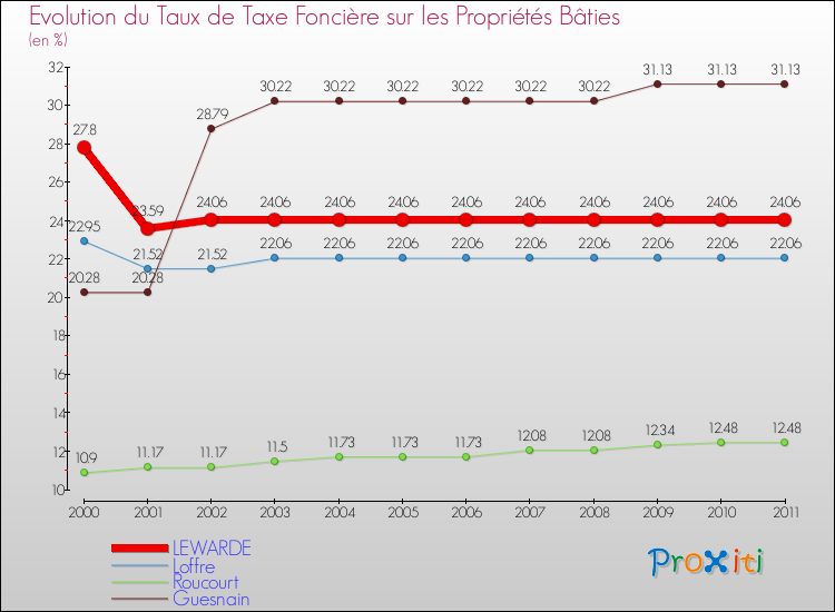 Pendant la même période, les communes françaises similaires à Lewarde, ont vu leur taux de taxe foncière sur le bâti augmenter de 21.76 % en moyenne entre 2000 et 2011.