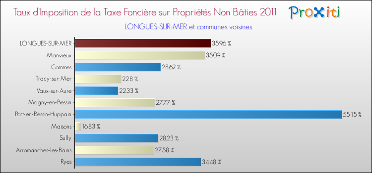 En 2011, le taux de la taxe foncière sur le non bâti vôté par le conseil municipal de Longues-sur-Mer était de : 35.96 %.