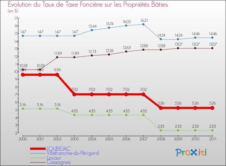 En 2011, le taux de la taxe foncière sur le bâti vôté par le conseil municipal de Loubejac était de : 5.26 %.
