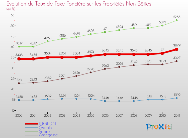 A Luglon, le taux de taxe foncière sur le non bâti a donc augmenté de 12.93 % entre 2000 et 2011.