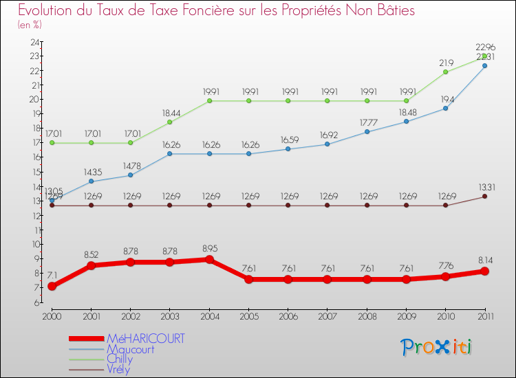 A Méharicourt, le taux de taxe foncière sur le non bâti a donc augmenté de 14.65 % entre 2000 et 2011.