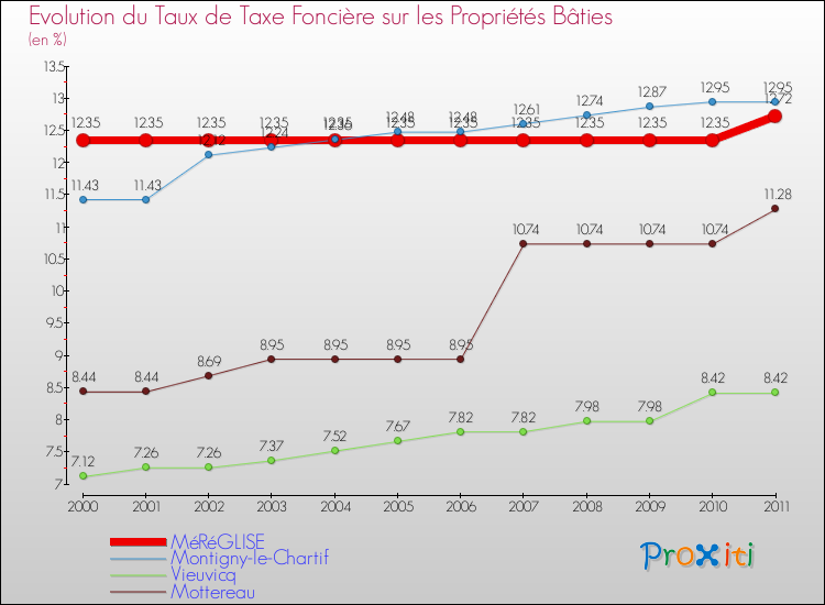 A Méréglise, le taux de taxe foncière sur le bâti a donc augmenté de 3 % entre 2000 et 2011.