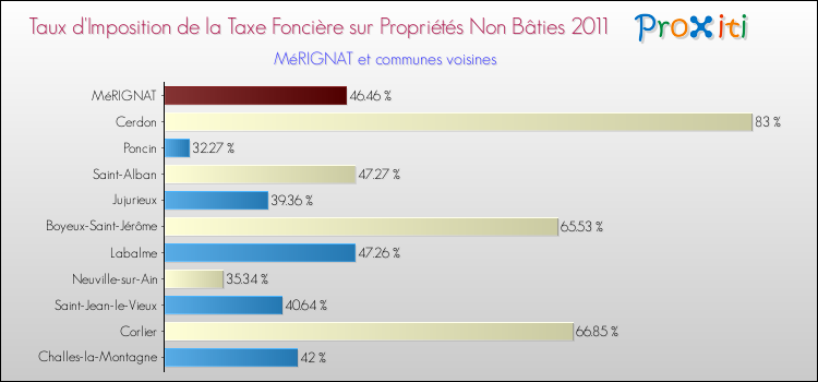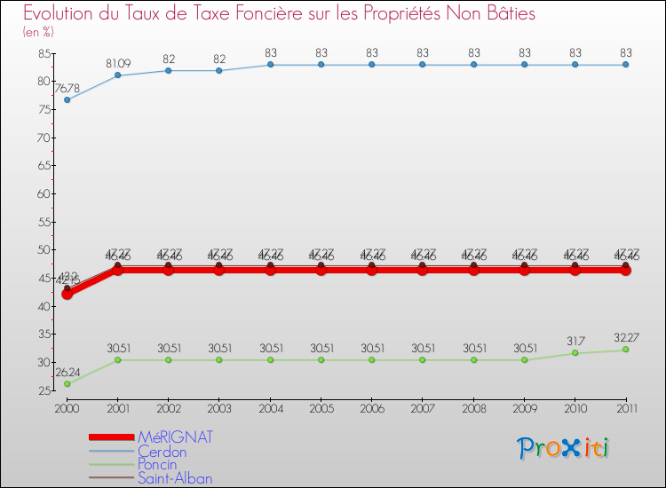 Pendant la même période, les communes françaises similaires à Mérignat, ont vu leur taux de taxe foncière sur le non bâti augmenter de 49.83 % en moyenne entre 2000 et 2011.
