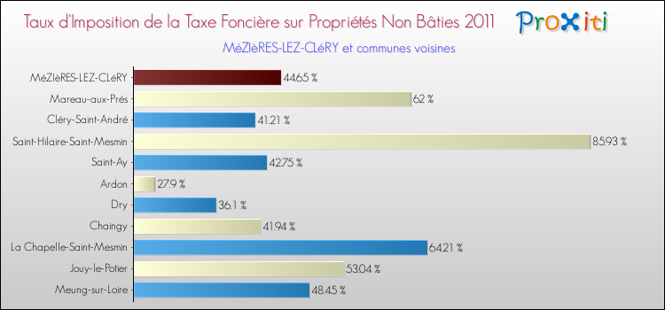 Pendant la même période, les communes françaises similaires à Mézières-lez-Cléry, ont vu leur taux de taxe foncière sur le non bâti augmenter de 27.19 % en moyenne entre 2000 et 2011.