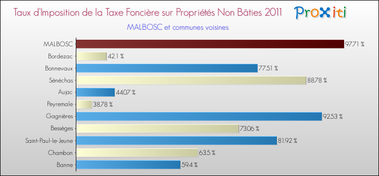 En 2011, le taux de la taxe foncière sur le non bâti vôté par le conseil municipal de Malbosc était de : 97.71 %.