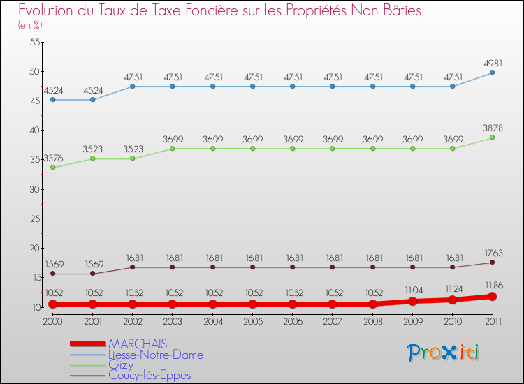 A Marchais, le taux de taxe foncière sur le non bâti a donc augmenté de 12.74 % entre 2000 et 2011.