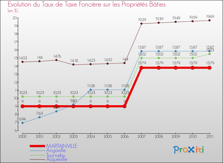 Pendant la même période, les communes françaises similaires à Martainville, ont vu leur taux de taxe foncière sur le bâti augmenter de 22.88 % en moyenne entre 2000 et 2011.