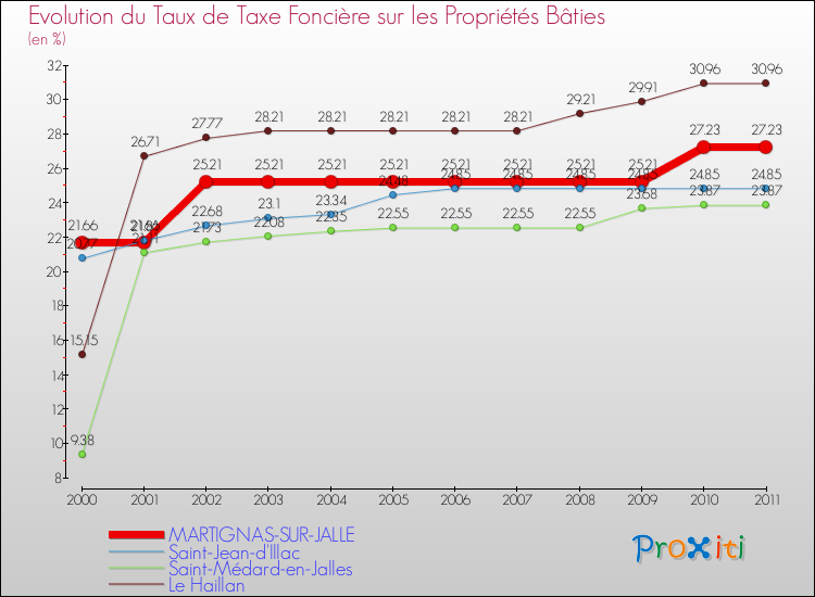 A Martignas-sur-Jalle, le taux de taxe foncière sur le bâti a donc augmenté de 25.72 % entre 2000 et 2011.