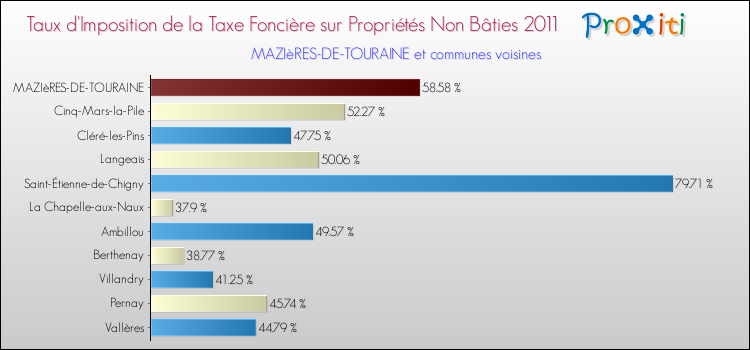 En 2011, le taux de la taxe foncière sur le non bâti vôté par le conseil municipal de Mazières-de-Touraine était de : 58.58 %.