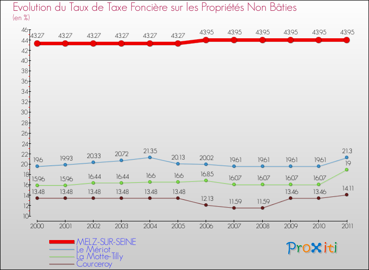 A Melz-sur-Seine, le taux de taxe foncière sur le non bâti a donc augmenté de 1.57 % entre 2000 et 2011.