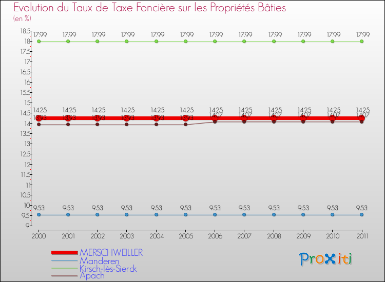 En 2011, le taux de la taxe foncière sur le bâti vôté par le conseil municipal de Merschweiller était de : 14.25 %.