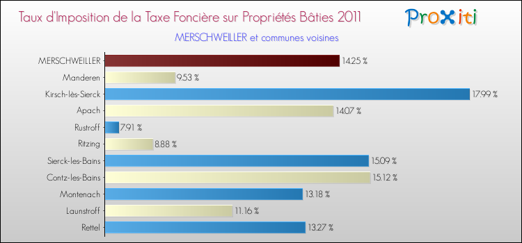 A noter : la valeur moyenne de ce taux de taxe foncière sur le bâti dans les communes françaises similaires à Merschweiller était de 10.11 %, en 2011.