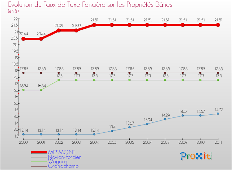 Pendant la même période, les communes françaises similaires à Mesmont, ont vu leur taux de taxe foncière sur le bâti augmenter de 7.9 % en moyenne entre 2000 et 2011.
