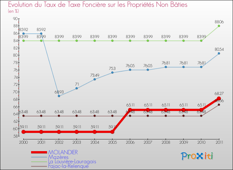 A Molandier, le taux de taxe foncière sur le non bâti a donc augmenté de 15.5 % entre 2000 et 2011.