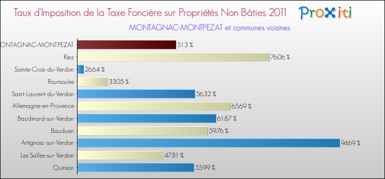 En 2011, le taux de la taxe foncière sur le non bâti vôté par le conseil municipal de Montagnac-Montpezat était de : 51.3 %.