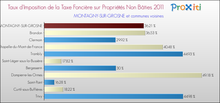 A noter : la valeur moyenne de ce taux de taxe foncière sur le non bâti dans les communes françaises similaires à Montagny-sur-Grosne était de 38.55 %, en 2011.