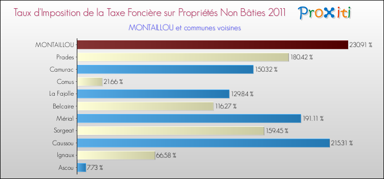 En 2011, le taux de la taxe foncière sur le non bâti vôté par le conseil municipal de Montaillou était de : 230.91 %.