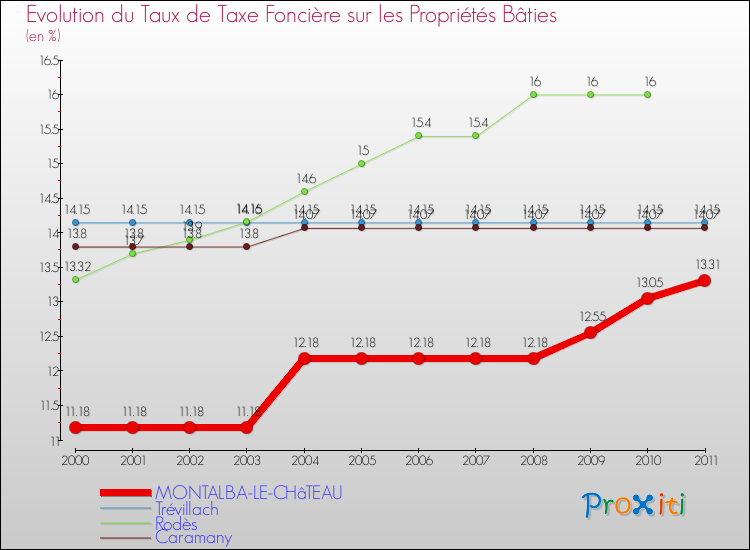 A Montalba-le-Château, le taux de taxe foncière sur le bâti a donc augmenté de 19.05 % entre 2000 et 2011.