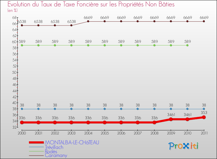 Pendant la même période, les communes françaises similaires à Montalba-le-Château, ont vu leur taux de taxe foncière sur le non bâti augmenter de 26.73 % en moyenne entre 2000 et 2011.