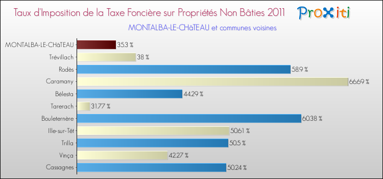 En 2011, le taux de la taxe foncière sur le non bâti vôté par le conseil municipal de Montalba-le-Château était de : 35.3 %.