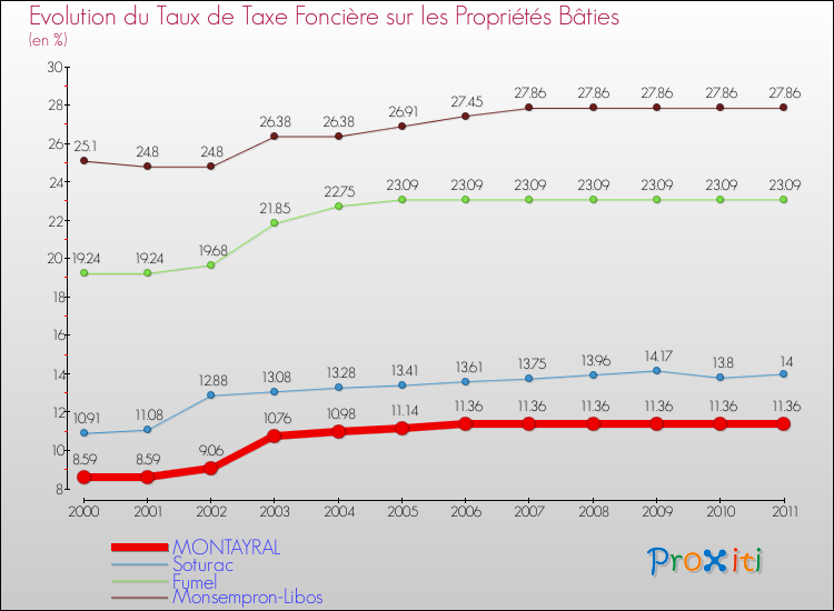 A Montayral, le taux de taxe foncière sur le bâti a donc augmenté de 32.25 % entre 2000 et 2011.