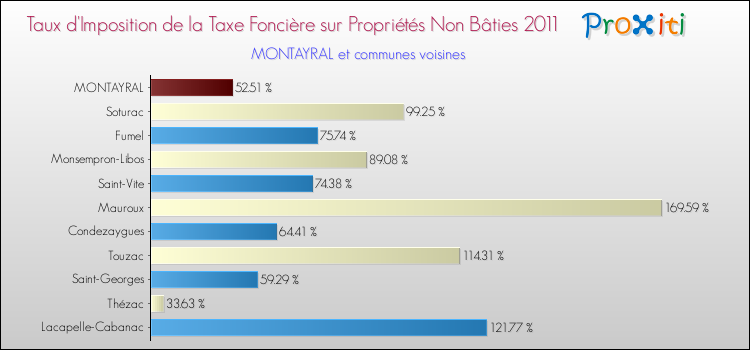 En 2011, le taux de la taxe foncière sur le non bâti vôté par le conseil municipal de Montayral était de : 52.51 %.