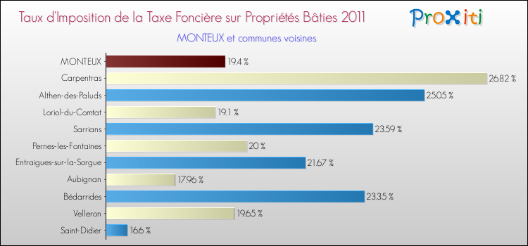 En 2011, le taux de la taxe foncière sur le bâti vôté par le conseil municipal de Monteux était de : 19.4 %.