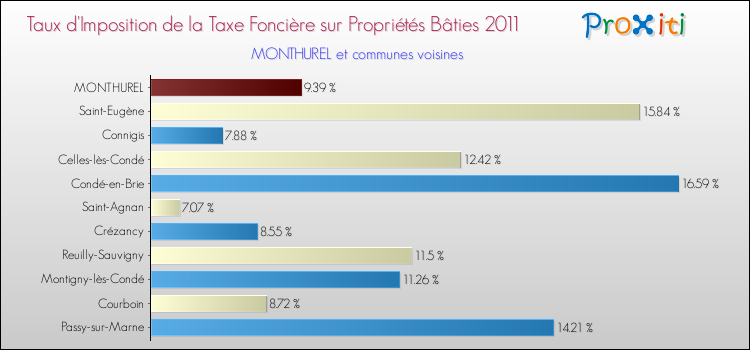 A noter : la valeur moyenne de ce taux de taxe foncière sur le bâti dans les communes françaises similaires à Monthurel était de 10.11 %, en 2011.