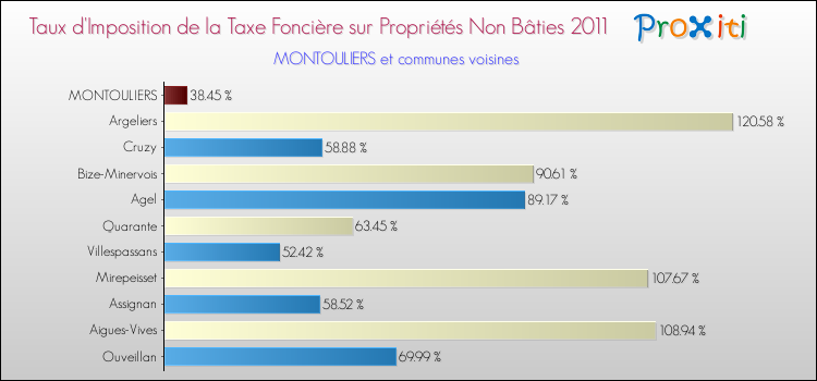 A noter : la valeur moyenne de ce taux de taxe foncière sur le non bâti dans les communes françaises similaires à Montouliers était de 38.55 %, en 2011.