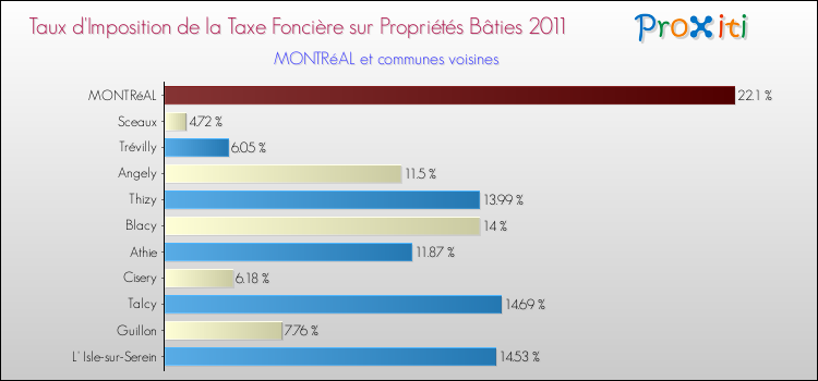 En 2011, le taux de la taxe foncière sur le bâti vôté par le conseil municipal de Montréal était de : 22.1 %.