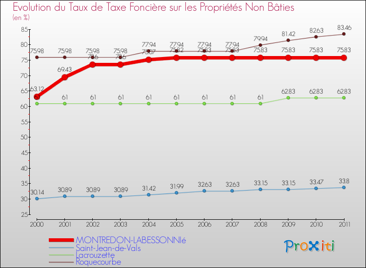 A Montredon-Labessonnié, le taux de taxe foncière sur le non bâti a donc augmenté de 20.14 % entre 2000 et 2011.