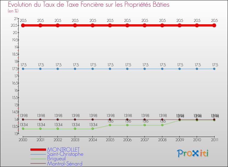A Montrollet, le taux de taxe foncière sur le bâti a donc augmenté de 0 % entre 2000 et 2011.