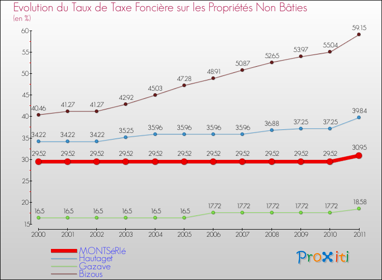 A Montsérié, le taux de taxe foncière sur le non bâti a donc augmenté de 4.84 % entre 2000 et 2011.