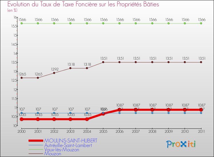A Moulins-Saint-Hubert, le taux de taxe foncière sur le bâti a donc augmenté de 5.02 % entre 2000 et 2011.