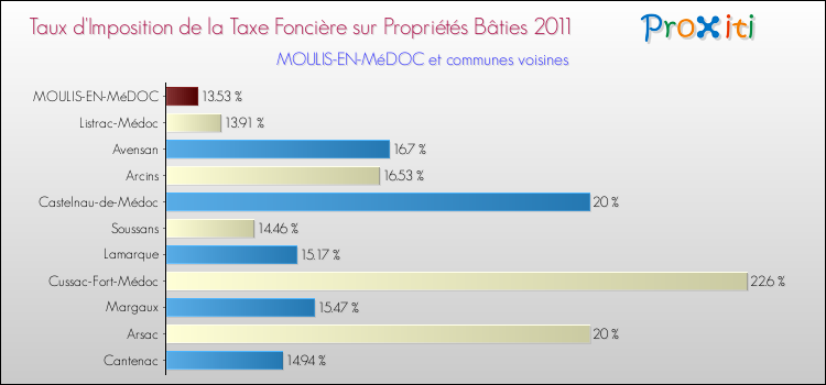 A noter : la valeur moyenne de ce taux de taxe foncière sur le bâti dans les communes françaises similaires à Moulis-en-Médoc était de 15.82 %, en 2011.