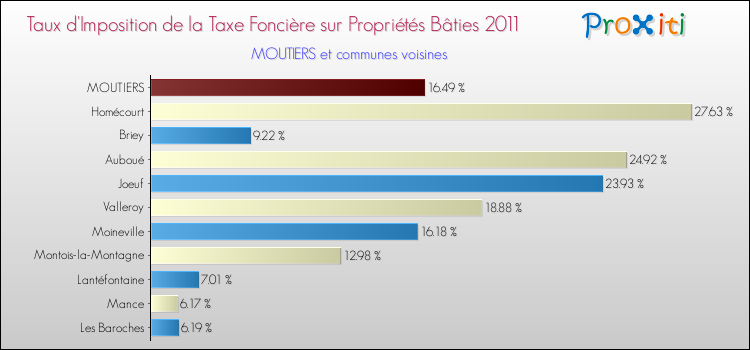 En 2011, le taux de la taxe foncière sur le bâti vôté par le conseil municipal de Moutiers était de : 16.49 %.